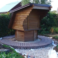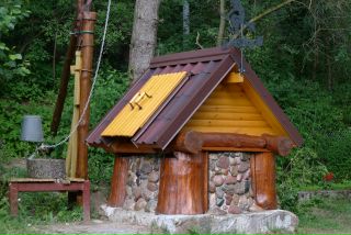 Отделка колодцев на даче часто связана с созданием определённой конструкции с декоративными и оборонительными функциями. Это – домик.