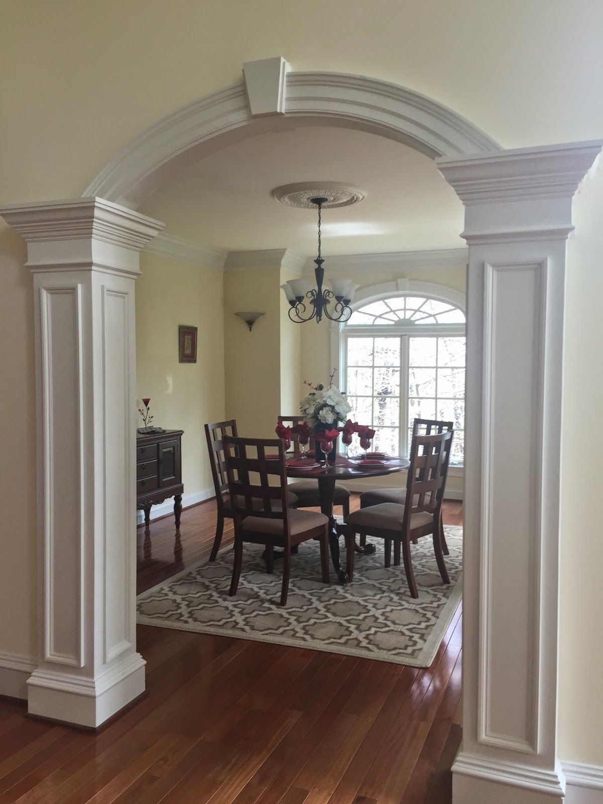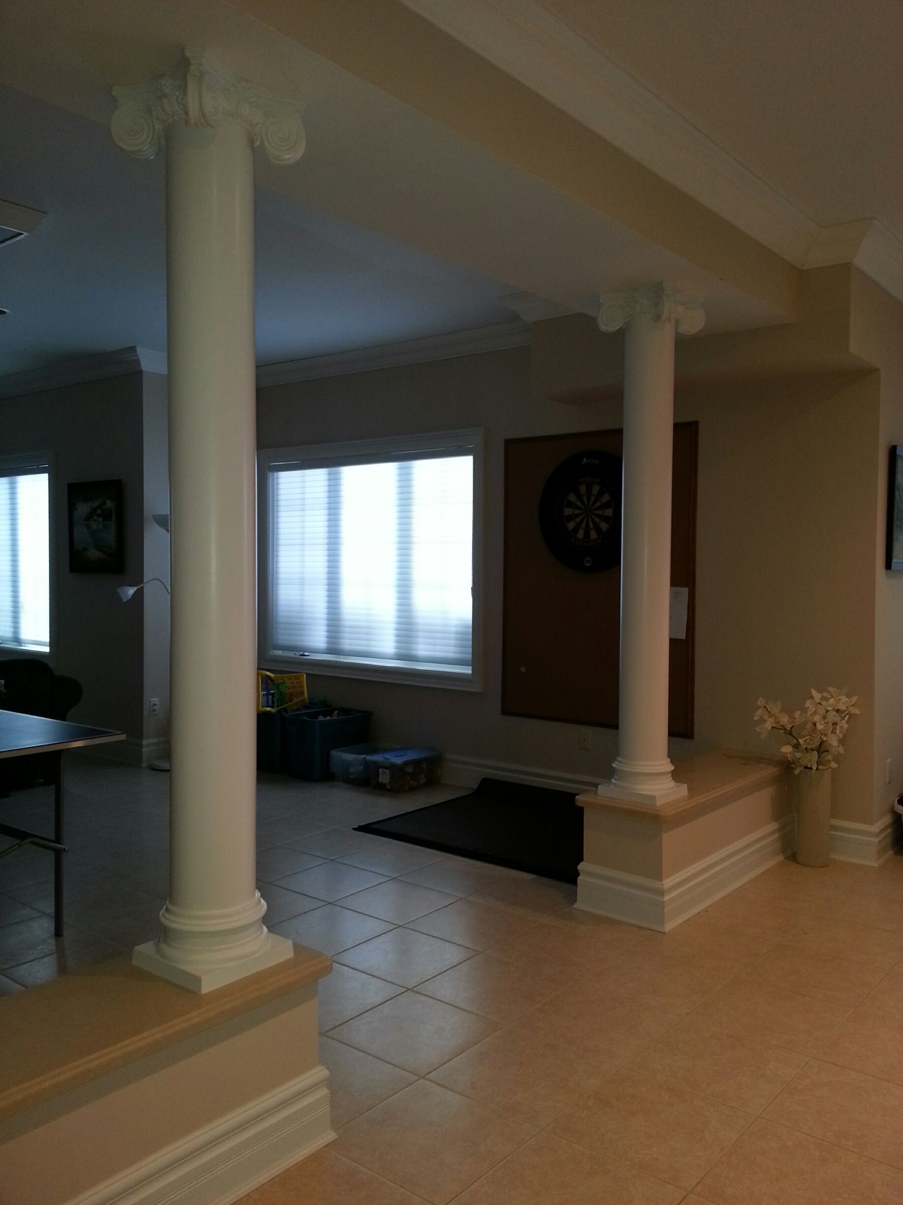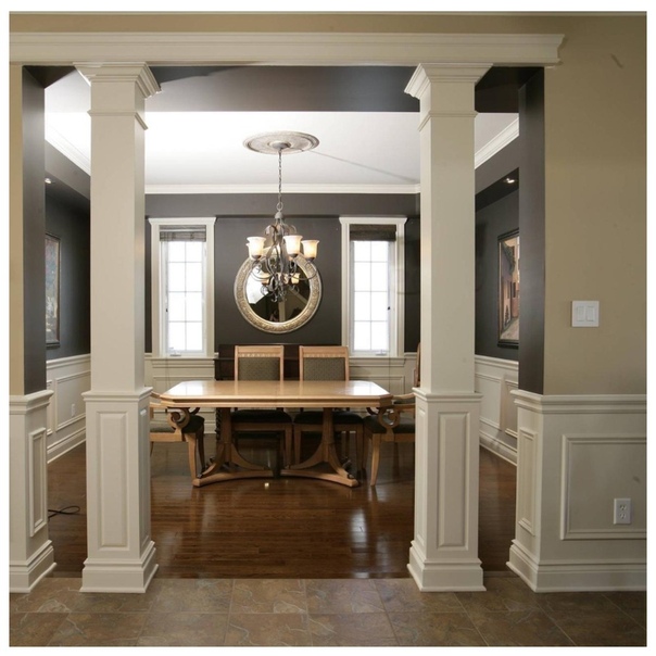 - Кстати, окрашенные колонны тоже смотрятся неплохо. На картинке сверху: декоративные колонны из гипсокартона, окрашенные тёмной перламутровой краской, создающей контраст стеновому и напольному покрытию.