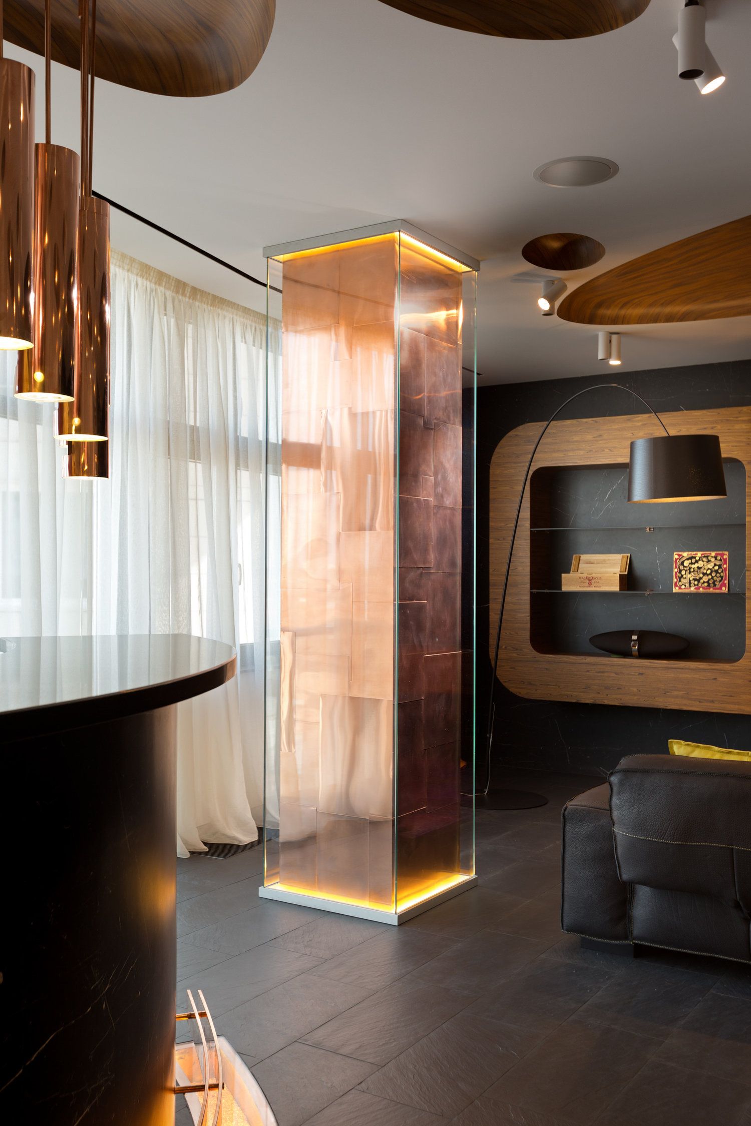 - Основная масса многоэтажного жилого фонда, особым простором помещений не отличается. Хотя, этот факт только заставил дизайнеров задуматься, как можно вписать колонну в небольшое помещение, чтобы она не занимала много места.