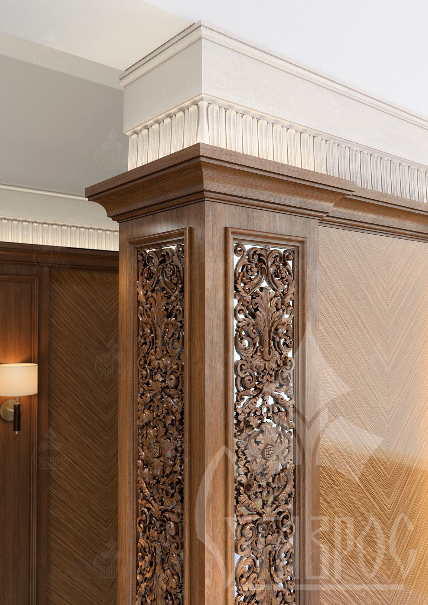 Облицовка стен и колонн древесными панелями