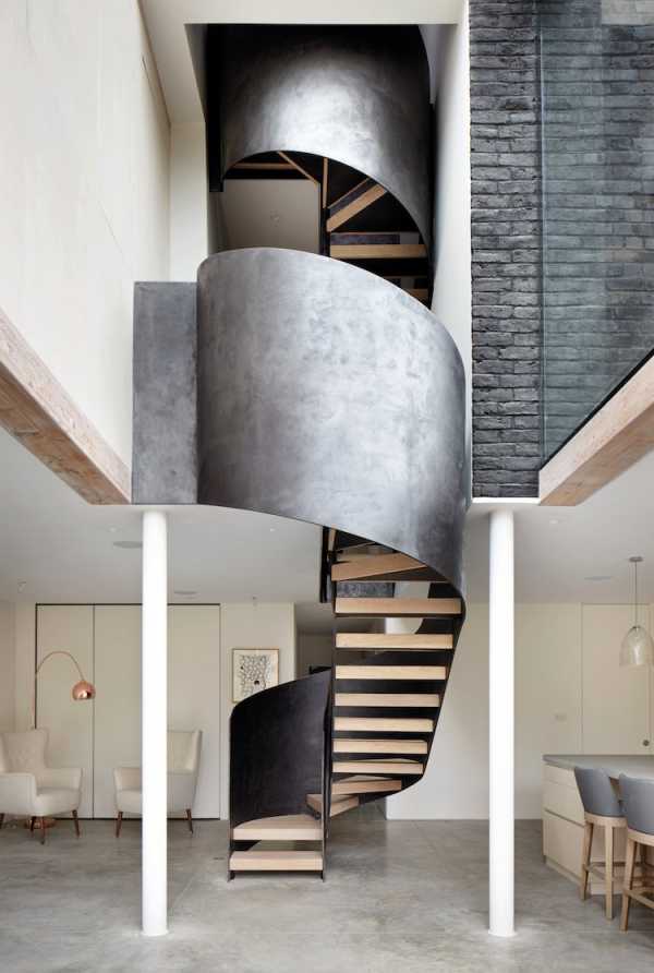 Для баланса условно «теплых» и «холодных» материалов в дизайне лестниц дерево нередко комбинируют с металлом. На фото вы видите винтовую лестницу в стиле лофт с массивными деревянными ступенями и спиралевидным ограждающим экраном из черненой стали, которая, несмотря на свой индустриальный вид, смотрится очень даже по-домашнему.