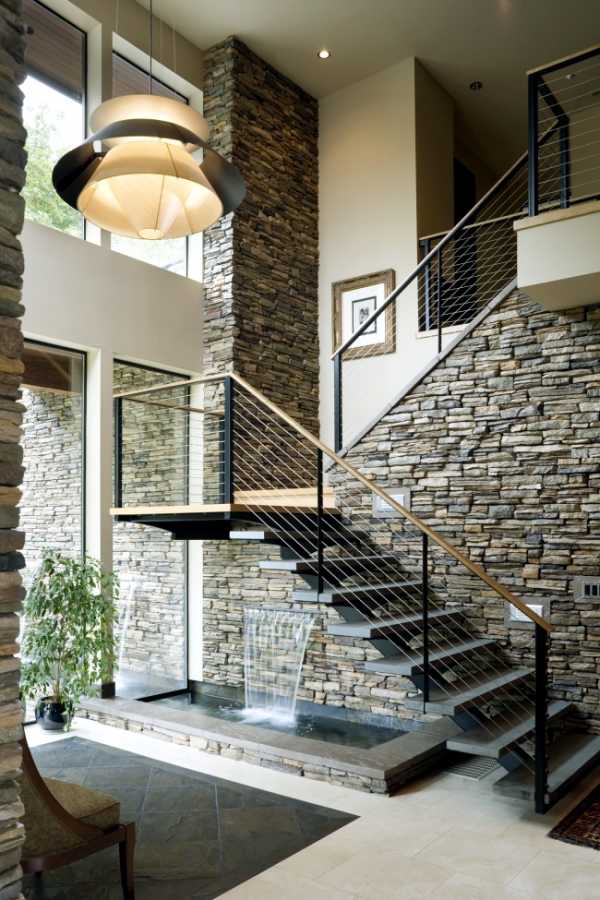 В качестве фоновой отделки стены, к которой примыкает металлическая лестница, может фигурировать натуральный или декоративный камень, а под маршем как раз найдется место для небольшого водоема с импровизированным водопадом.