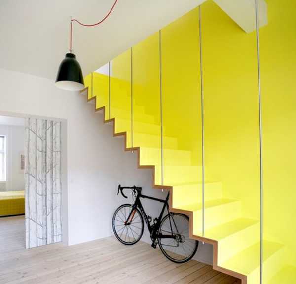Несмотря на свою конструктивную сдержанность, лестница на фото смотрится очень выигрышно за счет солнечно-желтого оттенка, перетекающего со ступеней на стену.