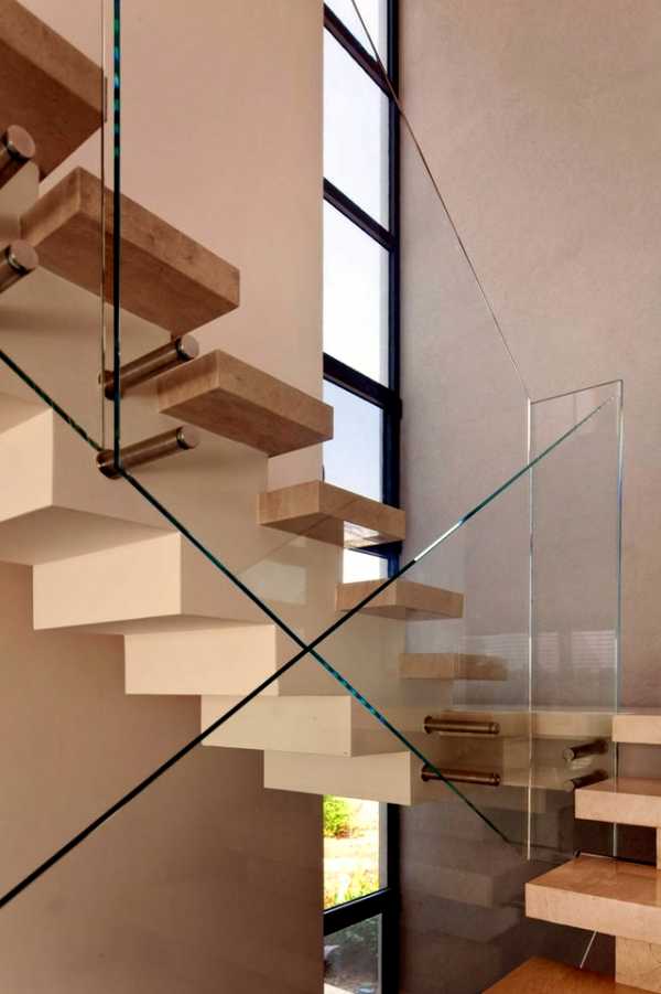 Консольная лестница со ступенями из многослойного каленого стекла будет идеальным дополнением к дизайну коттеджа в современном стиле.