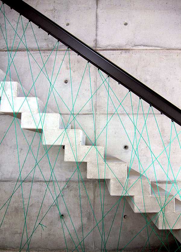 Лестницы из монолитного бетона с перилами из металлического профиля — неизменный атрибут стиля лофт. В дизайне этого лестничного марша использована яркая пряжа, которая вносит в монохромный урбанистический интерьер цветовой акцент.
