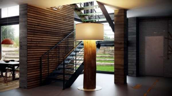Интересный вариант освещения лестничного пролета в просторном холле — использование массивного стационарного торшера с габаритным абажуром, установленного под лестницей. Единственное условие эффективного освещения в таком случае — марши со ступенями без подступенков.