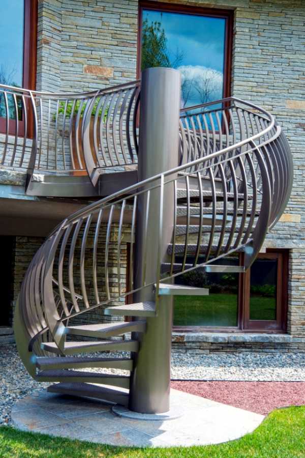 Винтовая входная лестница — не самый распространенный вариант экстерьерной конструкции, но насколько интересно она смотрится! Особый шарм ей придает металлическое ограждение, выгнутое по форме бочонка.