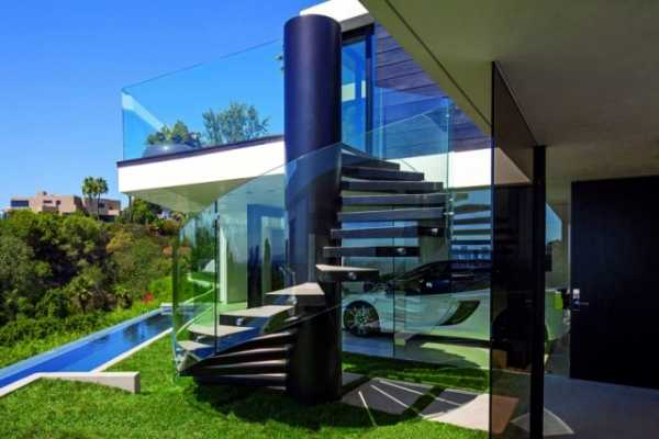 Каменные ступени, закрепленные на стальной опоре, и ограждение из гнутого стекла — ультрасовременная концепция дизайна входной лестницы для современного коттеджа.