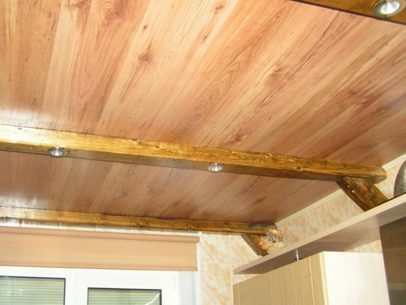 Приблизительное соотношение: балка – 100х100 мм, брусок – 50х50 мм. Важно, чтобы сам несущий элемент хорошо выделялся из потолочной поверхности. - По установленным брускам закрепляется листовой или реечный материал. Это может быть подрезанная под необходимые размеры фанера, ламинированная ДСП, ГКЛ, вагонка или рейки. Даже ламинат можно применять в этих целях.