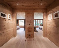 Потолки в шале высокие, деревянные и обязательно с крупными деревянными балками темного цвета, которые в современном интерьере являются элементом декора. Стены также деревянные или облицованные деревом, иногда с отделкой камнем.