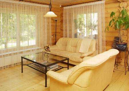 - Естественный. В доме с таким интерьером нет места искусственным материалам и лишнему декору. Все здесь максимально приближено к стилю старой русской избы или деревенскому кантри. Вагонка, блок-хаус, бамбуковые панели — материалы, которые смотрятся в таком доме наиболее уместно. Для пола используйте ламинат или паркетную доску — они придадут интерьеру шарм, усилив эффект старины. Можно оставить сруб чистым, обработав дерево соответствующими средствами. Помещения с такой отделкой светлые и просторные, проводить время в них приятно и полезно для здоровья (натуральная древесина выделяет в воздух полезные фитонциды).