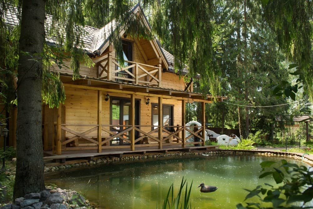Дом над водой «парит» на берегу небольшого пруда — любоваться видами можно с одного из 2 балконов. Внутрь ведет широкая деревянная лестница с перилами. Стены и крыша утеплены, есть печь-камин на дровах, выполнена звукоизоляция от дождя.