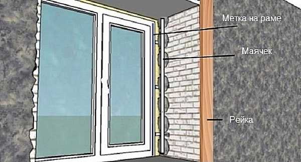 - По строительному уровню на внешнем углу оконного проёма устанавливается специальная рейка (маяк).