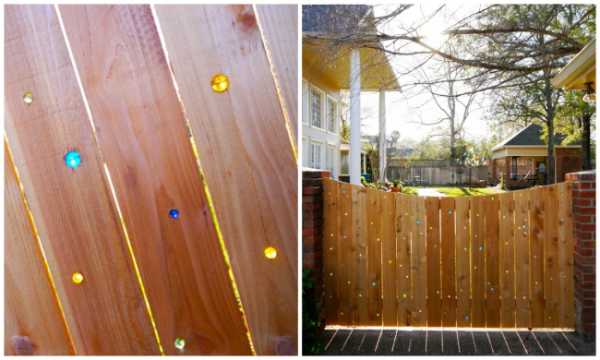 Еще одна идея для деревянного дачного забора — разукрасите его разноцветными стеклянными шариками. Их можно поискать в Икее. Получается волшебно, особенно игра солнечных лучей.