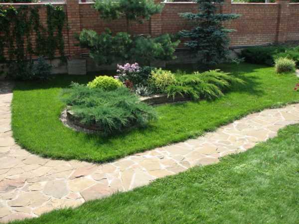 - Демонстративно прямые дорожки с бордюром, яркие цветочные островки на газоне удачно совмещают растительность и уложенные камни.