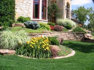 - Хорошим украшением участка будет небольшой газон с цветником, разбитыми перед самым домом из многолетних растений между которых можно высадить однолетки. Этим можно добиться беспрерывного цветения.