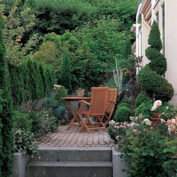 Эффектные акценты растениями, цветами сделают небольшой участок изысканным и уютным.