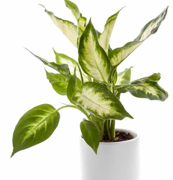 Стебель диффенбахии толстый и зеленый, форма пестрых листьев – овальная. Она плохо переносит сквозняки, любит влажность, нуждается в сохранении постоянной температуры и хорошем освещении. Чтобы куст формировался равномерно, он должен освещаться со всех сторон. Поэтому емкость с диффенбахией следует периодически переворачивать по оси. Растет эта культура довольно быстро. При обеспечении благоприятных условий новый лист появляется каждую неделю, а после его разворачивания внутри видно верхушку следующего. Размер взрослой диффенбахии зависит от ее сорта. Высота мощных видов к пяти годам составляет два метра и более, высота видов помельче – до одного метра. Своими широкими листьями это растение очищает воздух, поглощая содержащиеся в нем вредные вещества. Обрезку диффенбахии выполняют в перчатках, поскольку она может выделять яд.