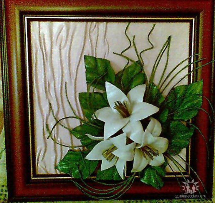 Получившиеся цветки или целые букеты размещаем красиво и симметрично на основе панно, которое затем помещаем в рамку.