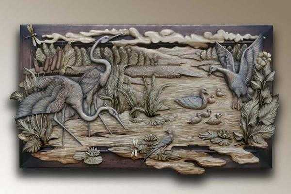 Представляет собой объемную картину из цельной деревянной пластины или составных элементов. Рисунок может создаваться методом резьбы или выжиганием.