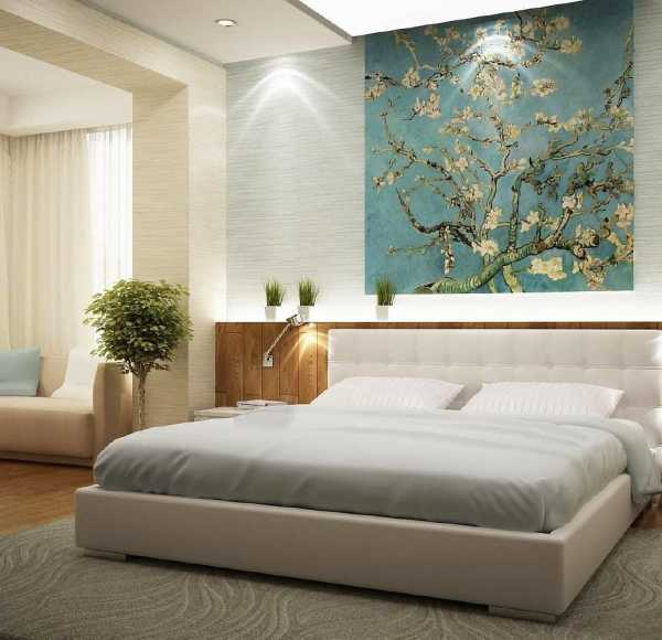 С помощью панно из обоев в спальне можно обозначить спальную зону, главное — выбрать правильное сочетание цветов