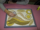 Начнем с самых простых моделей, которые может сделать даже ребенок. Например, хаотичный рисунок. Для этого, необходимо изначально нанести на основу фоновую ткань или песок с помощью клея и собрать рамку. Фон может быть окрашен в любой подходящий цвет до приклеивания материалов.