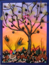 Все, что будет необходимо, это: лист плотного картона или ДСП, клей (лучше использовать термоклей, который застывает очень быстро), ножовка, лак и кисти и, конечно, ветки разных пород деревьев, отличающиеся толщиной. Для оформления рамки можно использовать деревянные рейки или багет.