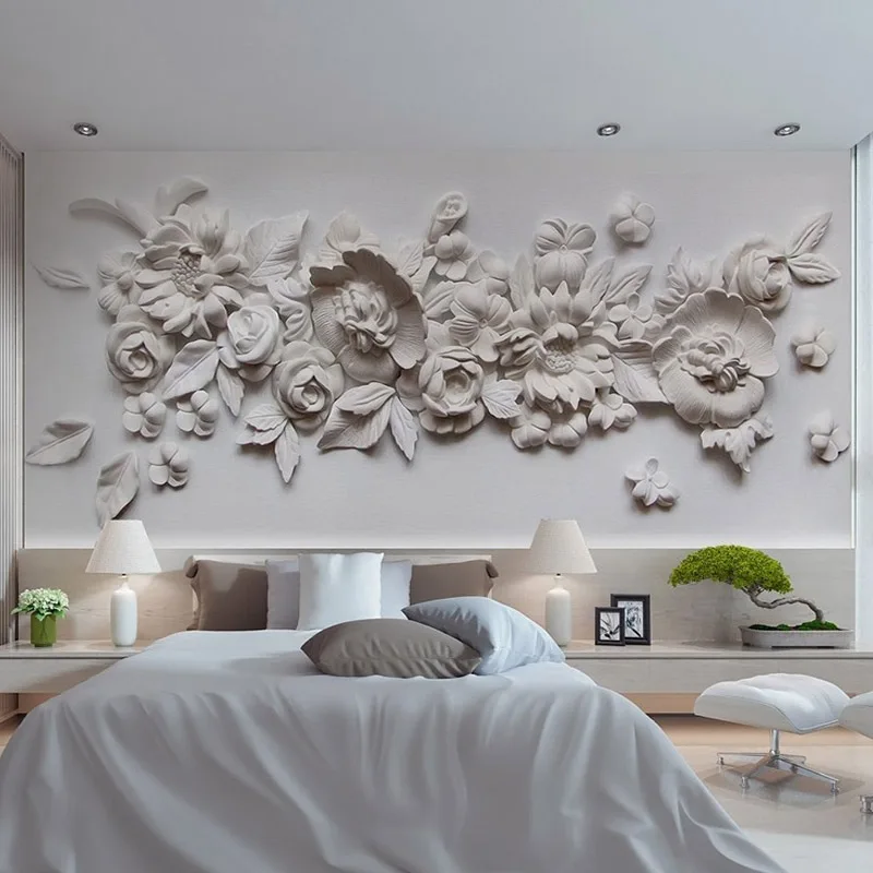 Впрочем, изображение может быть любым – от силуэтов цветов до животных и гоночных авто. Но можно и не использовать детализированное фото или имитацию художественной росписи, а отдать предпочтение выразительным фактурам. Сочетайте с одноцветными акварельными полотнами материалы с удивительной фактурой – бархат, фетр, металлизированные или перламутровые поверхности, точные имитации кожаной обивки, каменной мозаики или бамбука. В интерьерах эко-стиля уместны имитации природных отделочных материалов (пробки, травы, дерева), в минималистичных – металл и камень, в современных – уличное граффити, а в классических и античных – роскошные барельефы и стильные композиции из цветов.