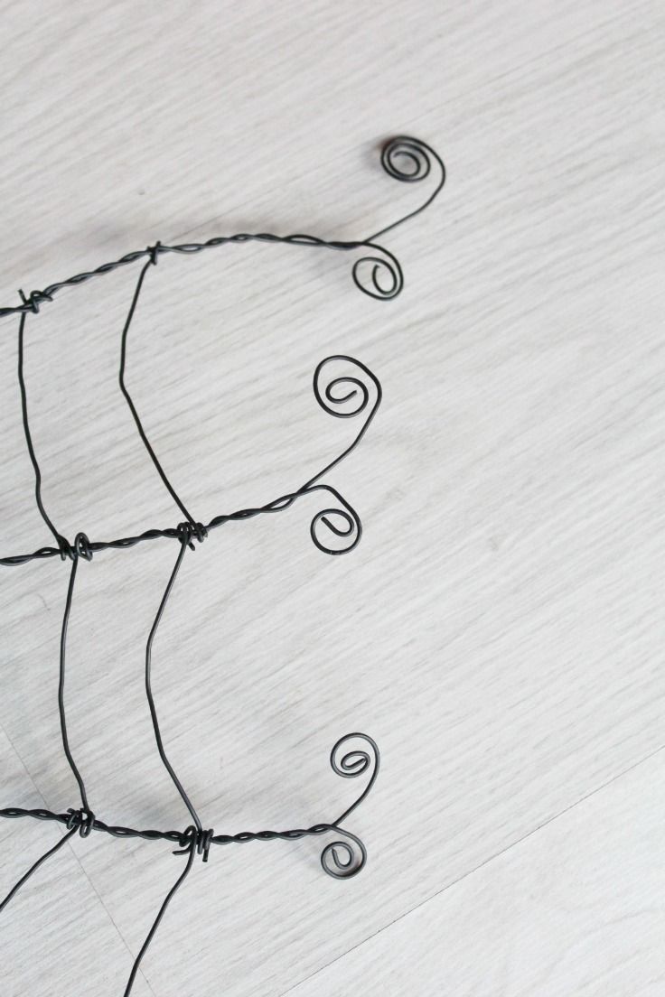Черной шерстяной ниткой оплетаем каждую проволоку, начиная от центра, далее по спирали одну ножку, пропускаем конец нитки в сгиб проволоки для лучшей фиксации, по спирали поднимаемся вверх и оплетаем таким же образом вторую ножку.