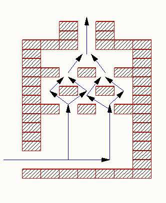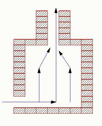 Схема Т-образной отопительной печкиЭтот вид печи как бы является частью стены, поэтому, несмотря на свою массивность, не занимает большой площади. В конструкцию может быть встроен компактный духовой шкаф или даже одноконфорочная варочная плита. Удачный вариант для выбора в том случае, если без печного отопления никак не обойтись в трех помещениях дома, но нужно сэкономить как можно больше места.