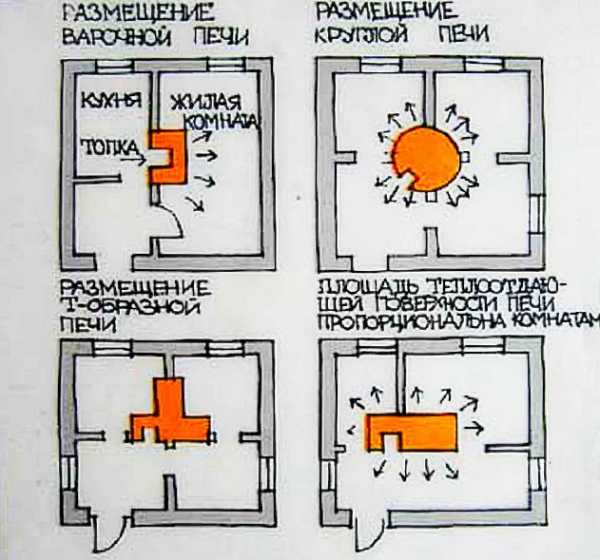 В компактных домах, состоящих из одной или нескольких помещений, печь обычно располагают в центре, так, чтобы ее стены были расположены во всех комнатах. Варочную поверхность и духовку размещают со стороны кухни, лежанку — в спальне или детской, а открытую топку камина — в гостиной или столовой.Обзор кирпичных печей