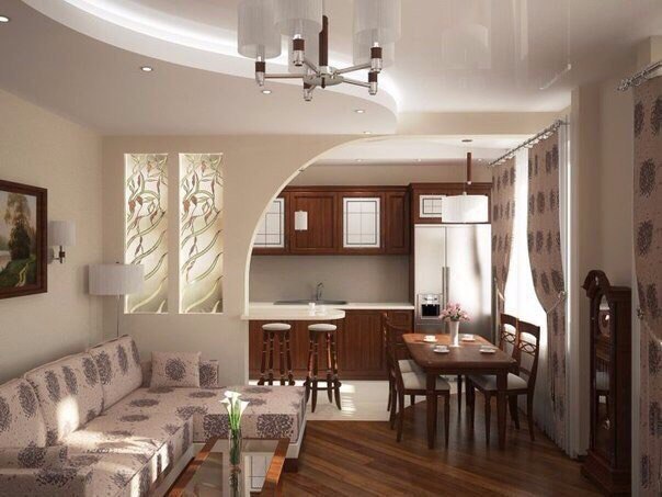 - Совмещение гостиной и кухни. При проведении подобных работ нужно будет снести стену, которая находится между комнатами, а дверной проём полностью закрыть. Что касается кухонной перегородки, то она или удаляется полностью, или же превращается в арку, которая ведет в гостиную. Некоторые дизайнеры также предпочитают использовать для данных целей стеклянные раздвижные системы, которые позволяют поделить комнату на несколько функциональных зон, визуально расширяя при этом пространство.