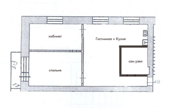 Привлекательно решение с созданием «квартиры-офиса», в котором крупная жилая комната сливается воедино с кухней и коридором. Все это пространство становится местом приема пищи и повседневного отдыха. Маленькая комната становится шире на 15 сантиметров, потому что передвинута перегородка, это помещение отводят под спальню и гардероб.