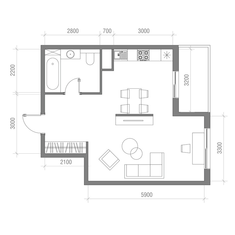 Целесообразно в подобных однокомнатных квартирах добиваться максимальной симметричности освещения.