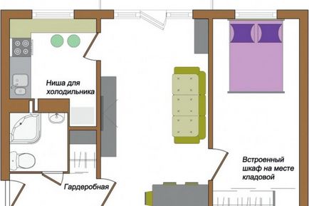 Недостаток перепланировки в том, что уменьшается площадь прихожей, но зато в гостиной теперь удобно расположить шкаф-купе, тем более, что место для вешалки и полки под обувь в прихожей найдется.