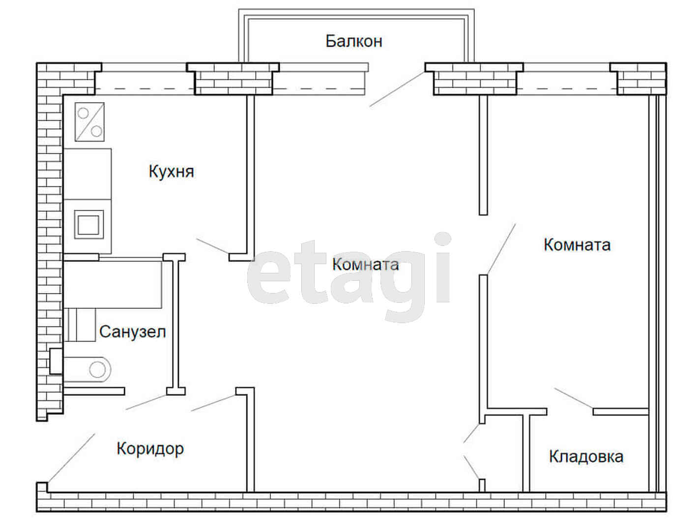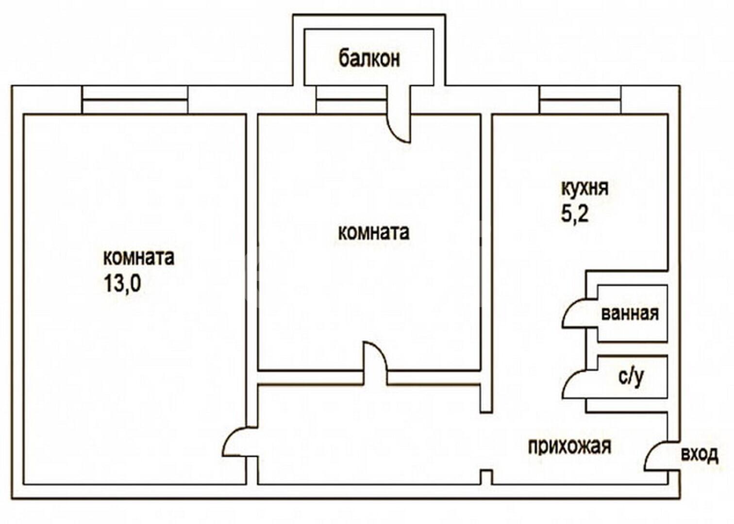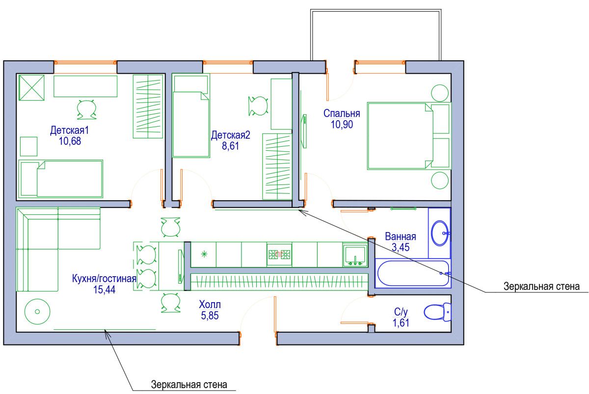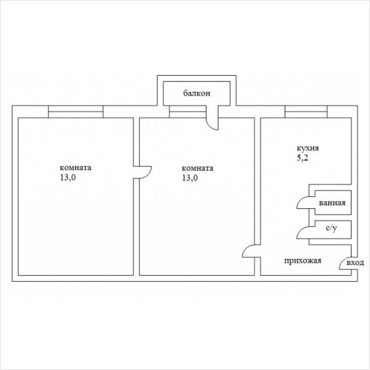 Планировка, прозванная «трамвай». Общая площадь квартиры 48 м², комнаты смежные, однако при перепланировке их можно разделить достаточно безболезненно.