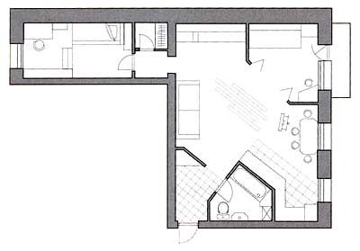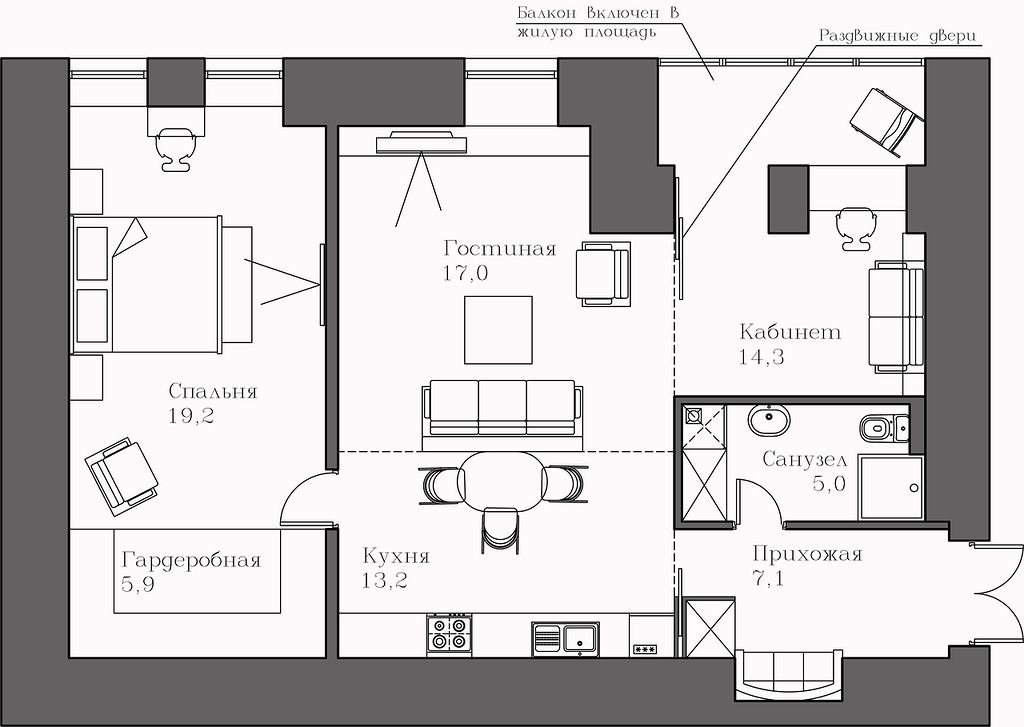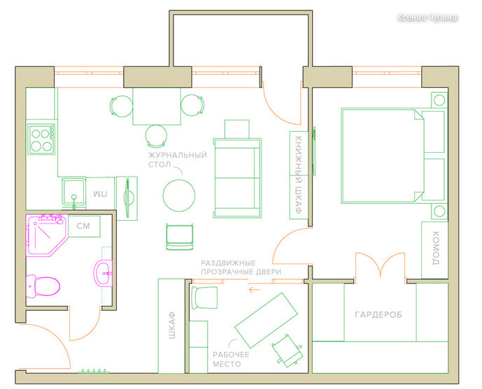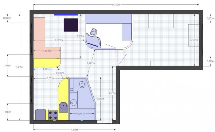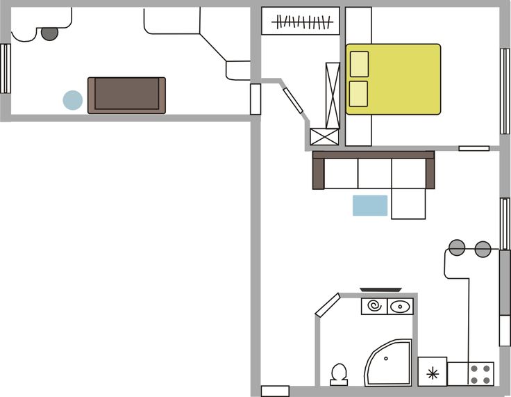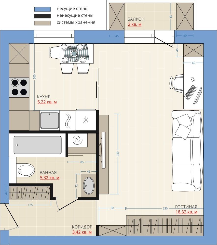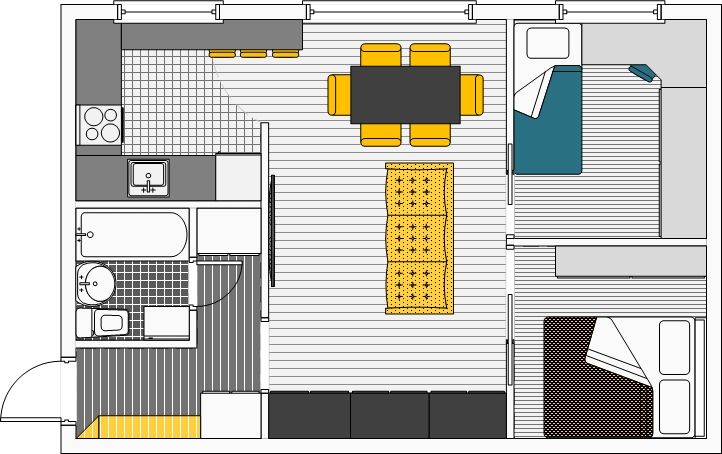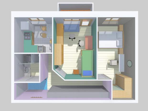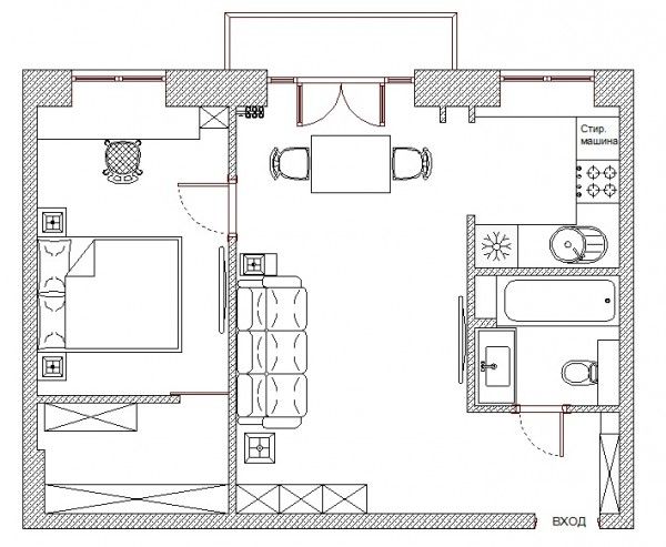 Решить проблему нехватки площади можно при помощи классического совмещения комнат. При этом для удобства жителей квартиры некоторые помещения все-таки разделяются и представляют собой функциональные зоны. Стандартная структура жилья с таким планом выглядит следующим образом: