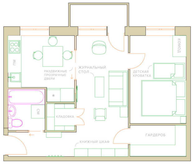 Самый радикальный вариант – убрать все ненесущие стены (кроме санузла и ванной) и зонировать одно большое помещение различными легкими перегородками и дизайнерскими приемами. В итоге может получиться очень симпатичная и комфортная квартира-студия. Однако далеко не каждой семье такой вариант подходит, многим нужны изолированные комнаты. Кроме того, по закону одна комната в квартире обязательно должна оставаться жилой.