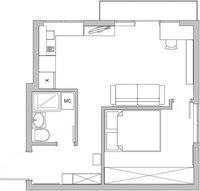 Например, на этом плане можно увидеть, что в дальнем углу гостиной поставили кровать и прикроватную тумбу. Зона спальни отделена частичной перегородкой, чтобы оставить доступ для естественного освещения, так как спальня без окна. Кухонная и обеденная зона объединены единой столешницей. Проведено зонирование при помощи напольного покрытия. Есть места для хранения как в прихожей, так и в гостиной.