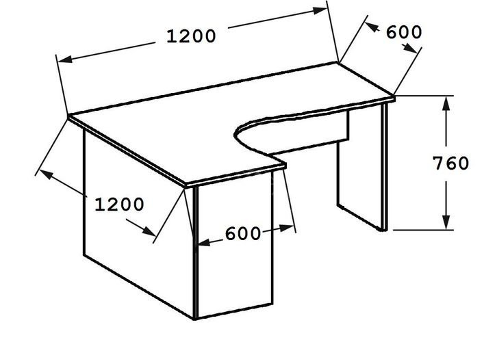 Для комфортной работы за таким столом, свободный проем (для размещения в нем пользователя) должен быть в пределах от 500 до 600 мм.