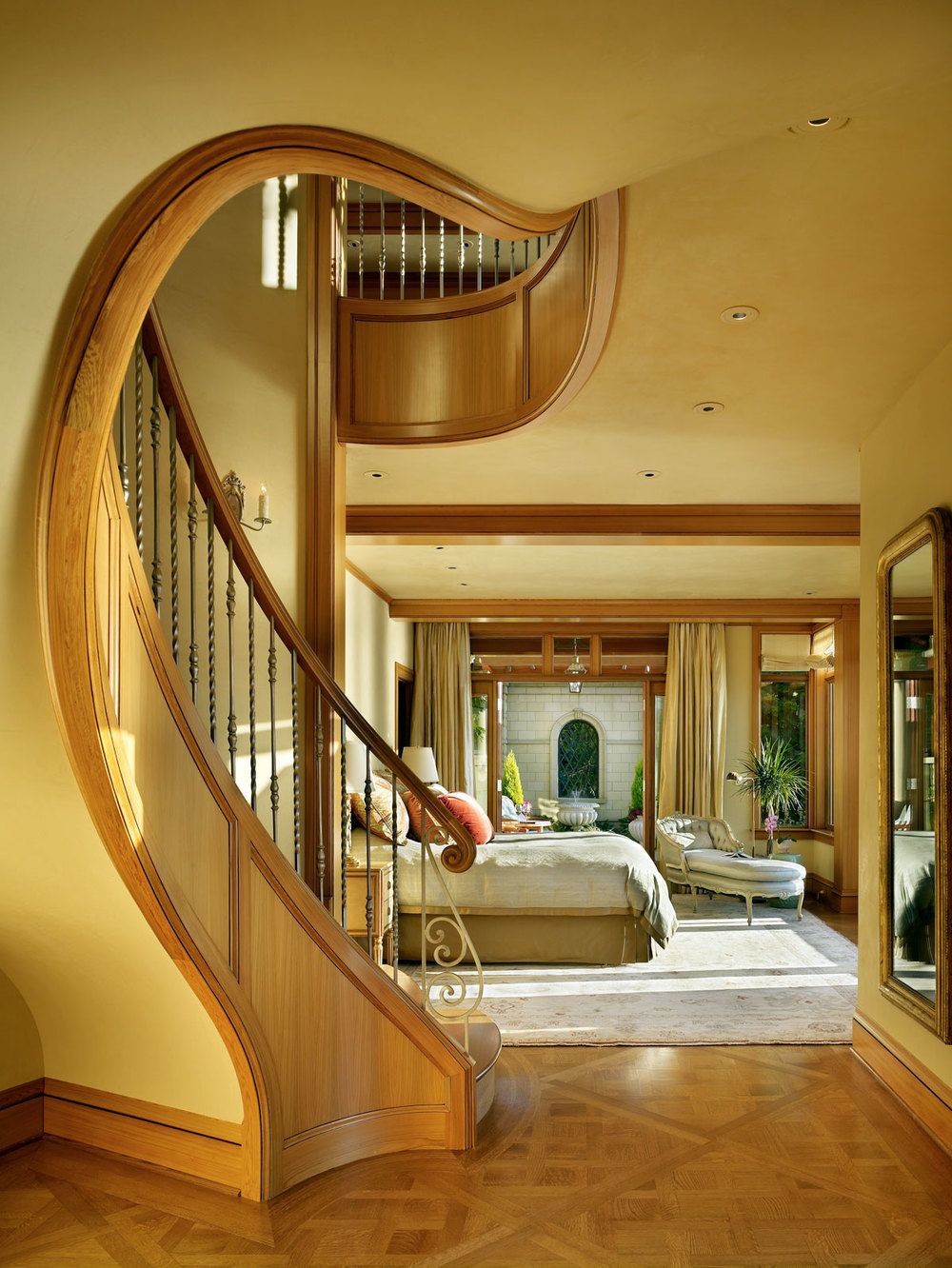 Отличным вариантом для небольшого помещения станет деревянная винтовая лестница, которая располагается в углу дома
