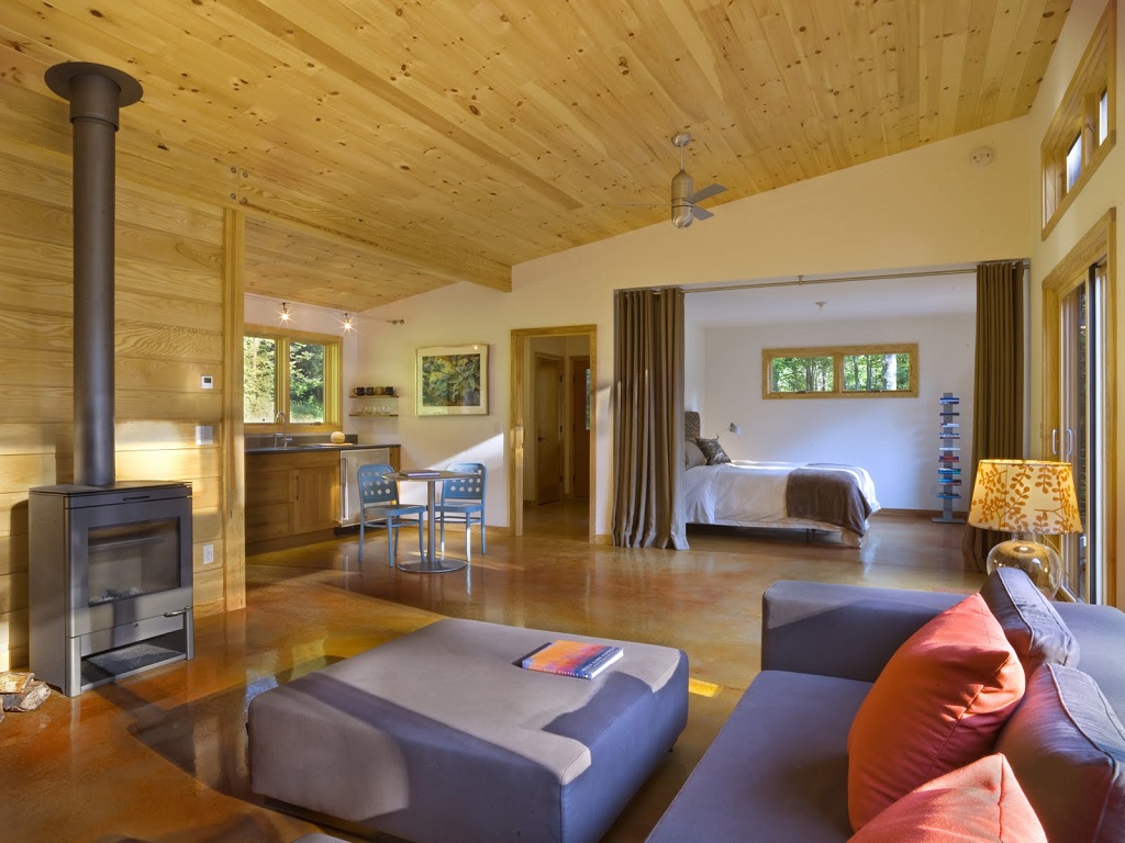 Очень популярным является решение объединения кухни и гостиной в рамках одного участка дома. Это очень удобно для приема гостей, ведь не придется бегать из кухни в гостиную с посудой и едой. Такие комнаты называют еще кухней-студией.