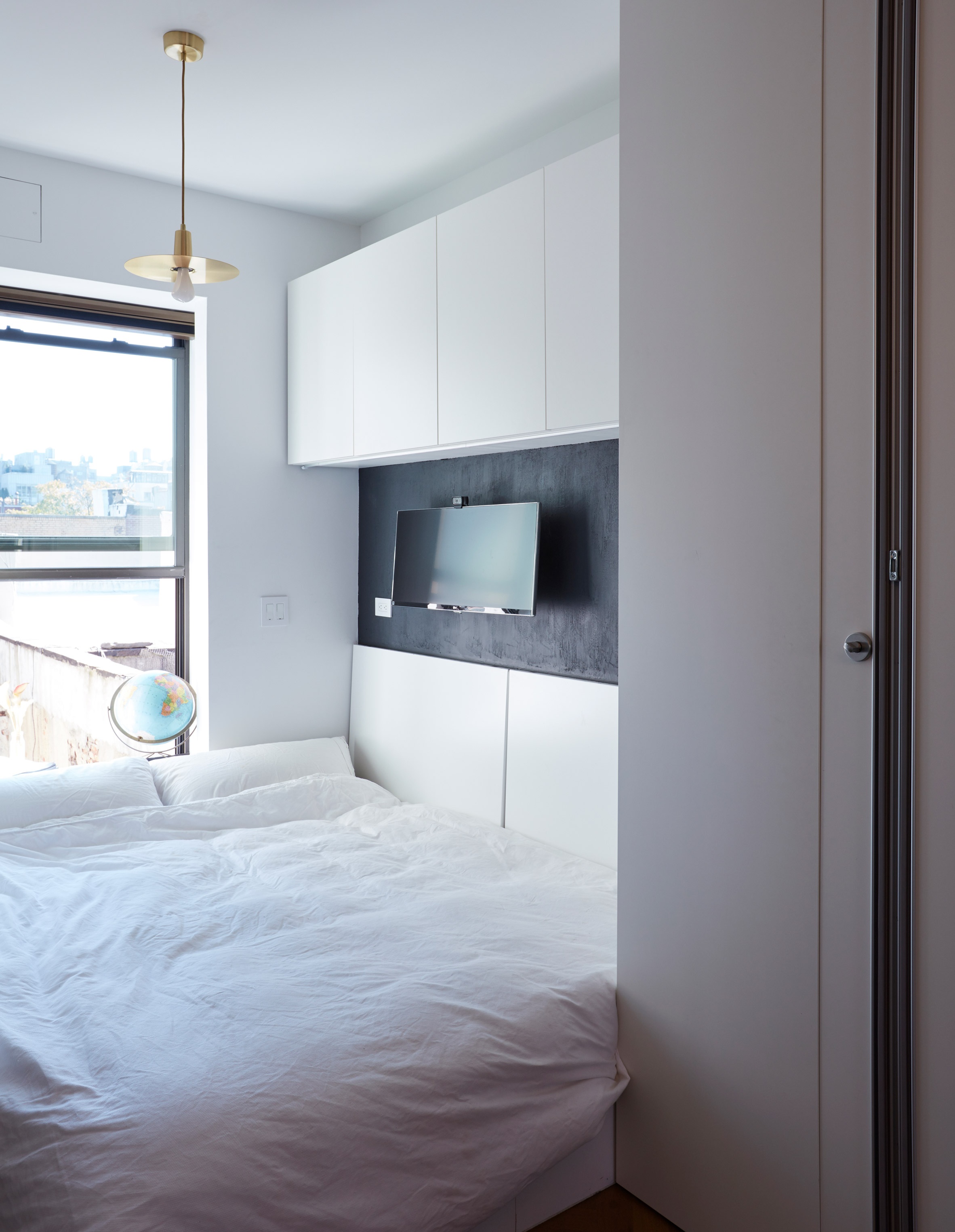 Не захламляйте маленькую территорию мебелью. Стандартный набор: кровать, шкаф для одежды и прикроватная тумбочка. Также можно разместить на стене зеркало.