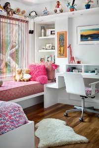 Учебный стол — важный предмет мебели, который нужен подростку, когда она кладет долгие часы перед решающими тестами и экзаменами. В небольших помещениях не всегда есть роскошь большого рабочего стола. Вот тут-то и пригодится письменный стол, удобно обернутый вокруг угла. Встраивайте в стены полки для хранения книг и экспонатов.