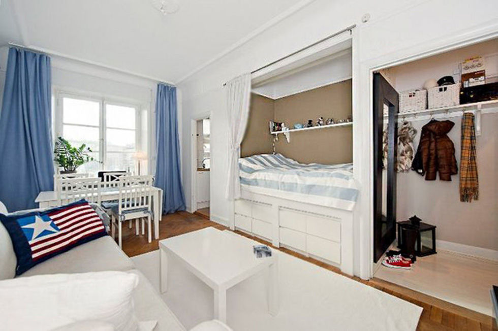 Зачастую кровать в нишах заменяют на матрас, уложенный на подиум. В подиуме необходимо разместить небольшие контейнеры для хранения одежды и постельного белья, а также выдвижные ящики. Таким образом имеющееся пространство будет использоваться наиболее рационально.