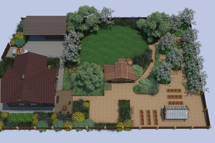 Кроме построек, не забудьте о месте для сада и огорода: в этой части располагаются плодовые деревья и кустарники, грядки, цветники, теплицы и садовый инвентарь.