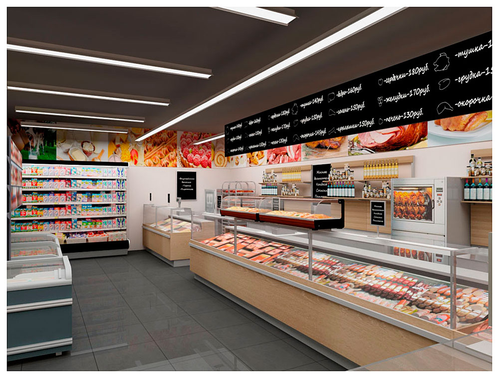 К примеру, в представленном компанией «Вятка-ЭКО» проекте площадь минимаркета составила 56 кв. м. На данной площади были размещены холодильное оборудование для демонстрации и хранения мяса, рыбы, сыров и колбас, замороженных продуктов, молочный и фруктово-овощной отделы, кондитерские изделия и бакалея, хлебная продукция. При этом продуманная планировка, рациональная ширина проходов и грамотная выкладка сделали данный магазин не только удобным для покупателей, но и выгодным для владельца.