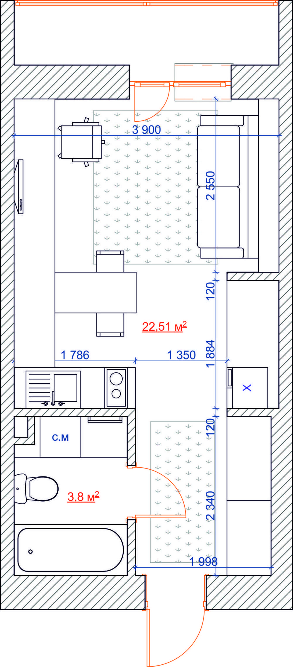 Главное преимущество студии в том, что в результате перепланировки образуется одно просторное пропорциональное помещение. Стенами будет огорожен только санузел, совмещенный с ванной, а остальные перегородки будут снесены.