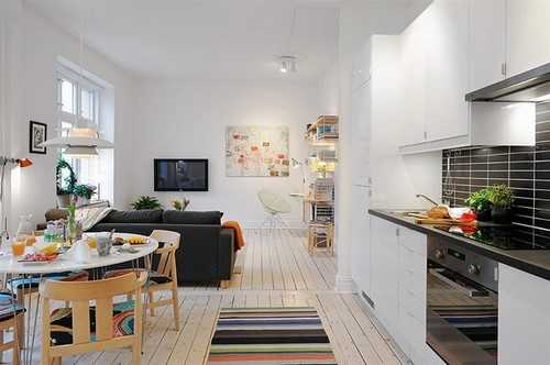 - Минимизация расстояния между всеми зонами квартиры – кухней, гостиной и спальней.