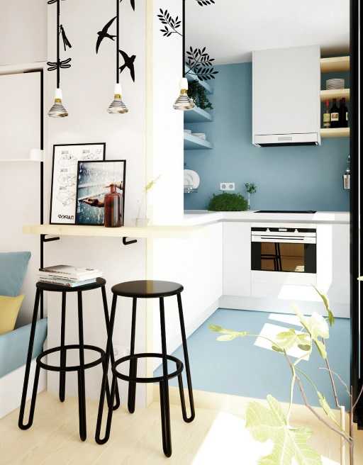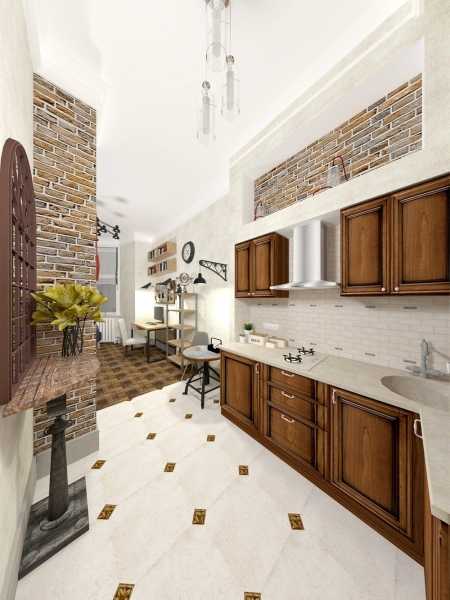 На заметку! Можно обустроить разный уровень пола, который разделяет две основные зоны – кухню и салон для гостей.